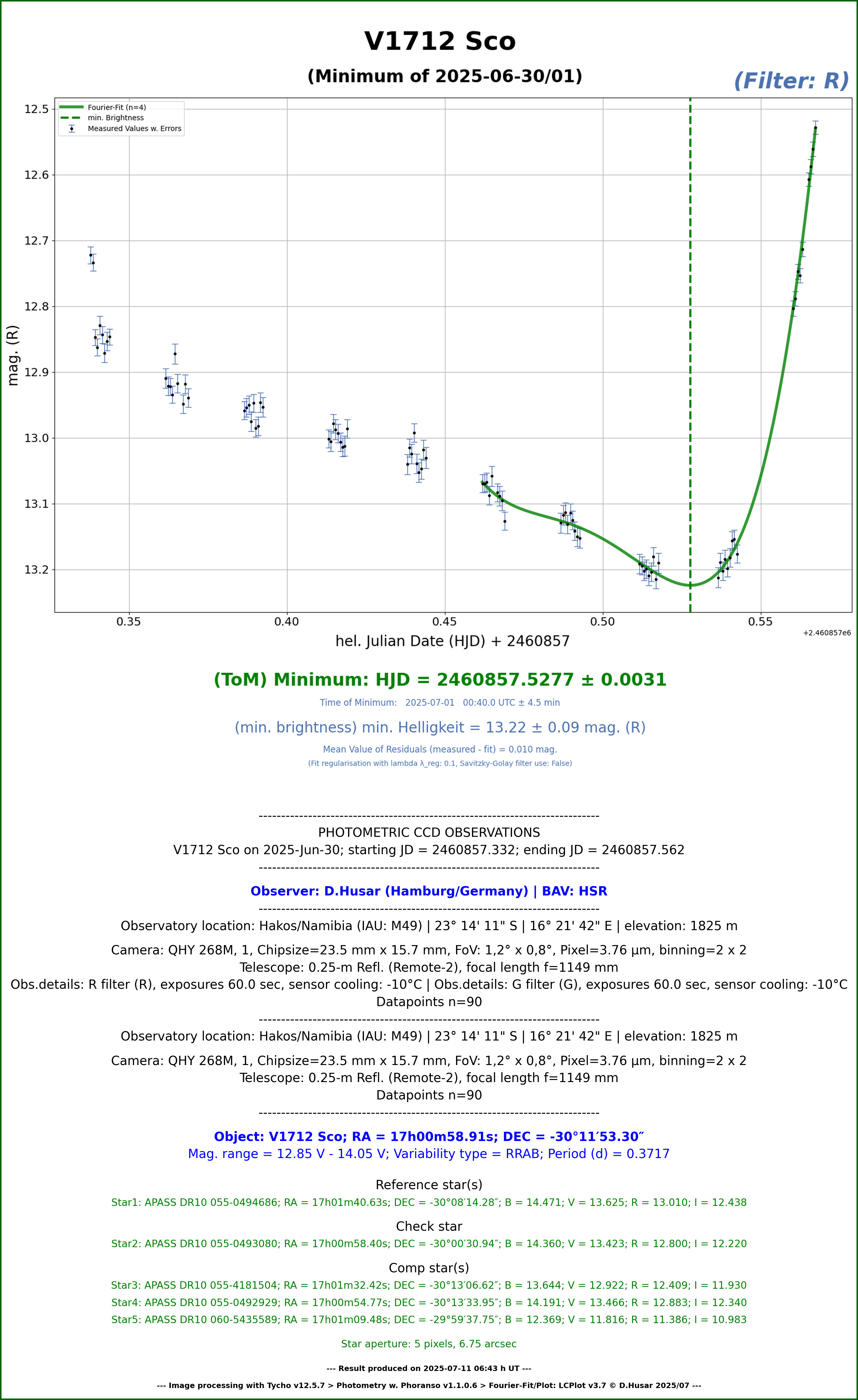 10.9.2025 | Eine neue Nova : V4371 Oph, entdeckt am 5.9.25. mit Magnitude 12.5 (CV). MAximum möglicherweise bei 10.8 (V) am 9.9.25 kurz nach Mitternacht. Eine Nacht später bei 11.1 mag. Spektren deuten auf eine klassische Fe Nova hin. Die AAVSO bittet in einem Alert (#905) um Beobachtungen. |
